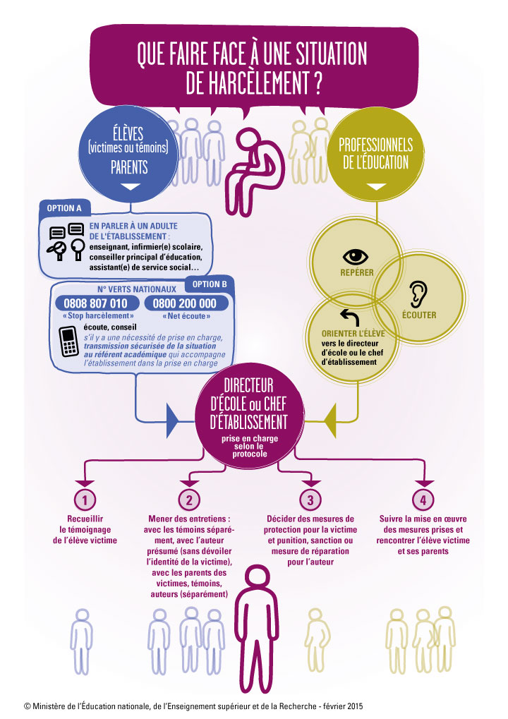 Le harcèlement est une violence répétée qui peut être verbale, physique ou psychologique. Cette violence se retrouve aussi au sein de l'école. Elle est le fait d'un ou de plusieurs élèves à l'encontre d'une victime qui ne peut se défendre.